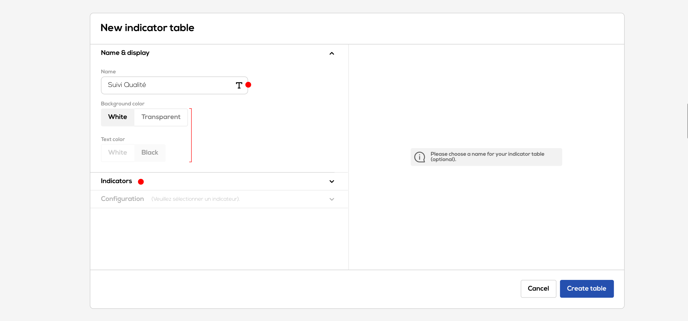 - Choose a name for your indicator table