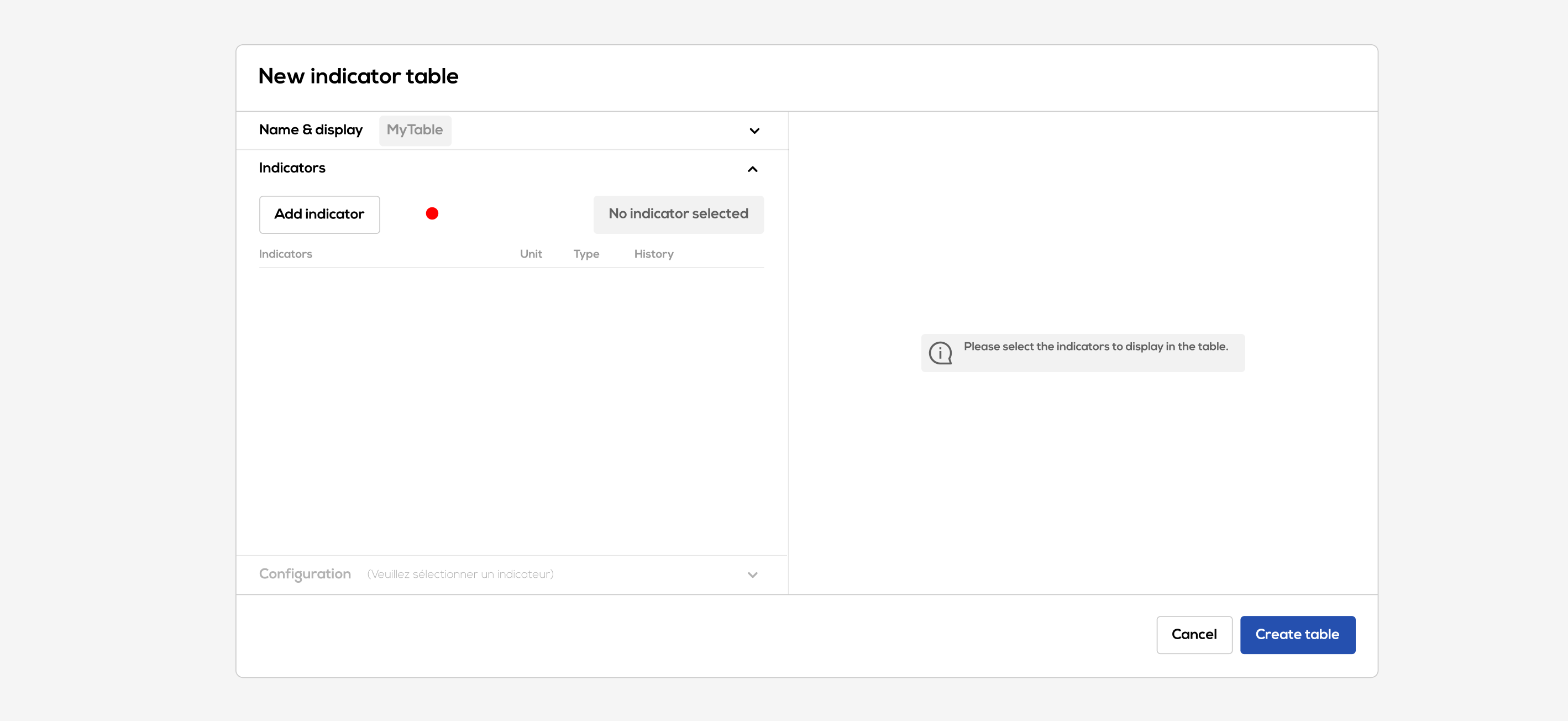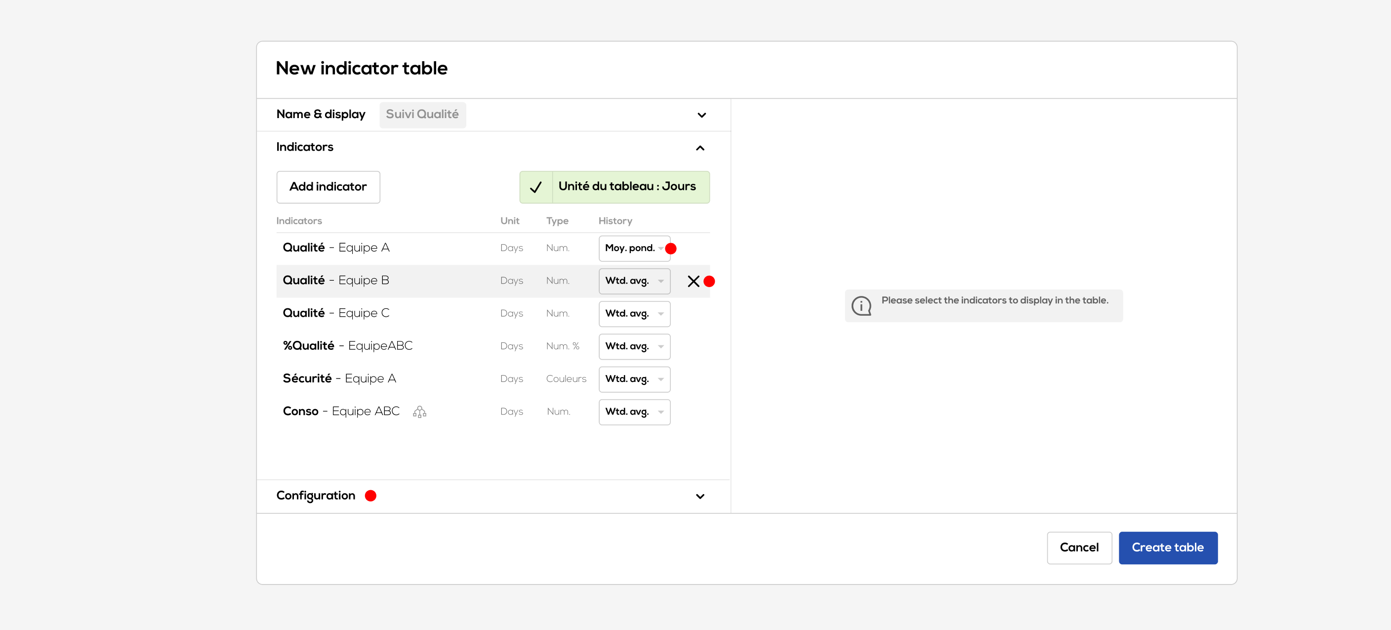 The new indicators table configuration window opens :