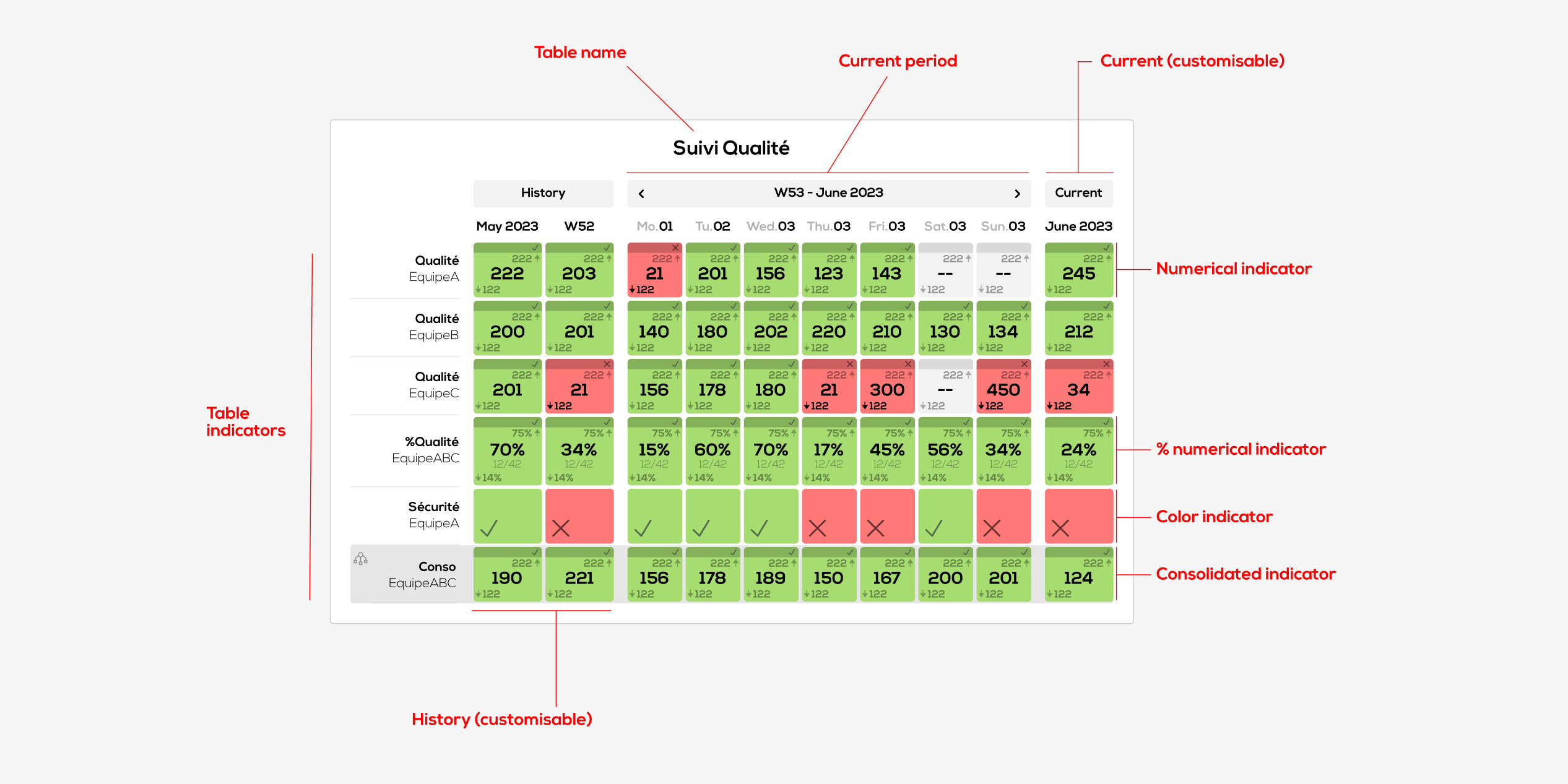 Calculation mode of history and current month : for each indicator, you can choose to calculate the history using a sum, average or weighted average (only for % indicators) function.
