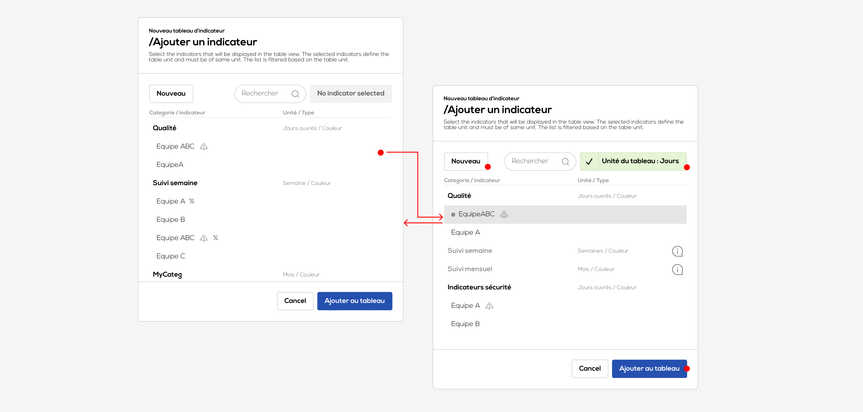 When you select the first indicator, the table automatically set its unit to the indicator unit (here days). Indicator of others units (here week and month) become unavailable in the list.