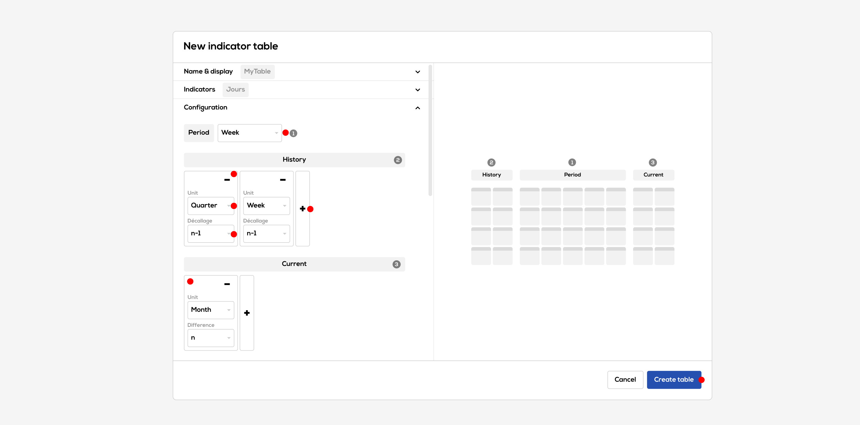 In the "Indicators" section, you can manage the table indicators list :