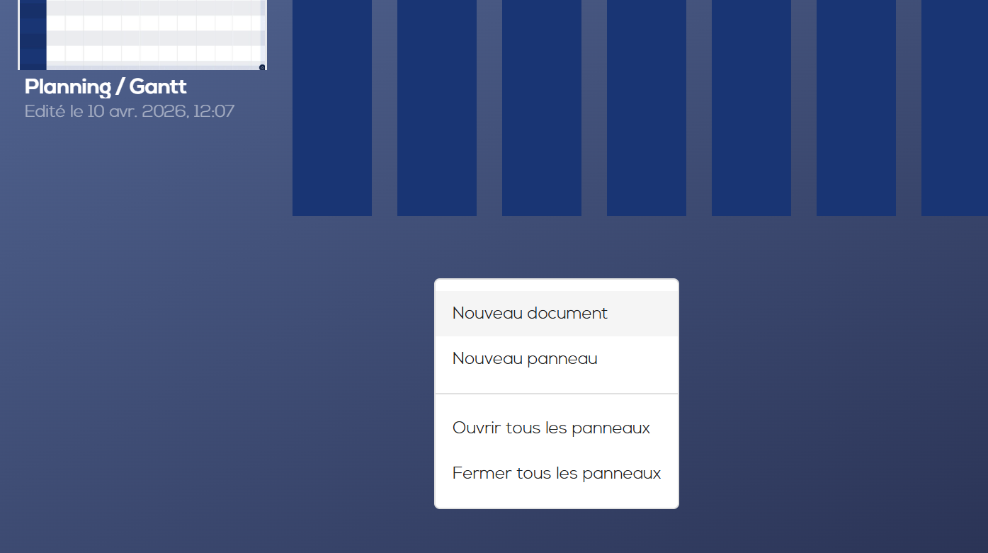 Effectuez un click droit sur le fond pour : créer un nouveau document, créer un nouveau panneau, ouvrir tous les panneaux, fermer tous les panneaux.